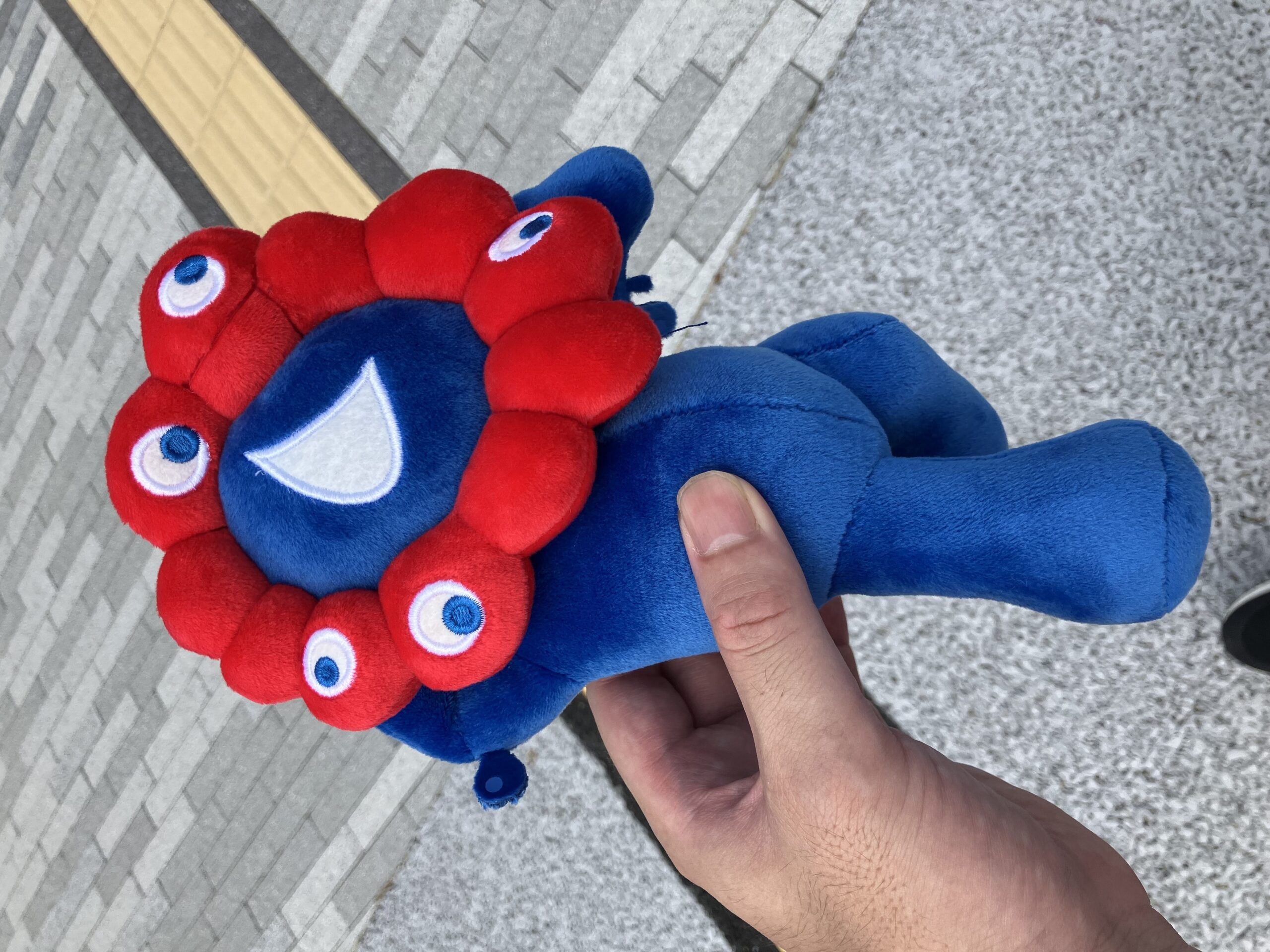 寝そべったミャクミャクのぬいぐるみで、1等が全長約80cm、2等が約46cm、3等が約23cm、です。